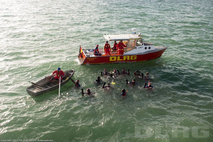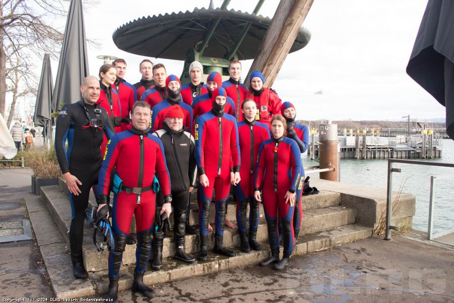 Pünktlich um 13 Uhr stiegen 15 Teilnehmer:innen bestehend aus aktiven Einsatztauchern und Strömungsrettern der DLRG Bezirk Bodenseekreis sowie ein Mitglied des Tauchsportclubs Friedrichshafen an der Schlosskirche Friedrichshafen in den Bodensee.
