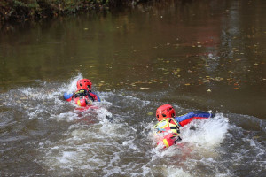 Am Vormittag wurden landseitig die relevanten Basics wie Knotenkunde, Standardverfahren der Seiltechnik sowie der Umgang mit Raft und Sanitätsausstattung in der Strömungsrettung geübt. Auch verschiedene Techniken zur Spannung von Seilen und Kappen der Verbindung unter Spannung konnten ausprobiert werden.