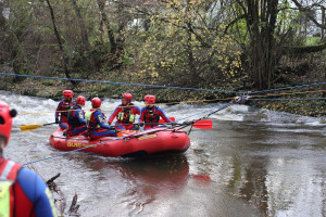 Trotz widriger Wetterbedingungen folgte nach einer Stärkung am Mittag die Verlegung an die Schussen. Hier galt es ein Einsatzszenario einer Personenbergung zu bewältigen. In den zuvor trainierten Gruppen wurde eine Flachseilbrücke über den Fluss aufgebaut, um anschließend mittels Raft eine Bergung in der Strömung durchführen zu können. Anschließend wurde zum weiteren Abtransport eine Schräghangrettung an der steilen Uferböschung aufgebaut.