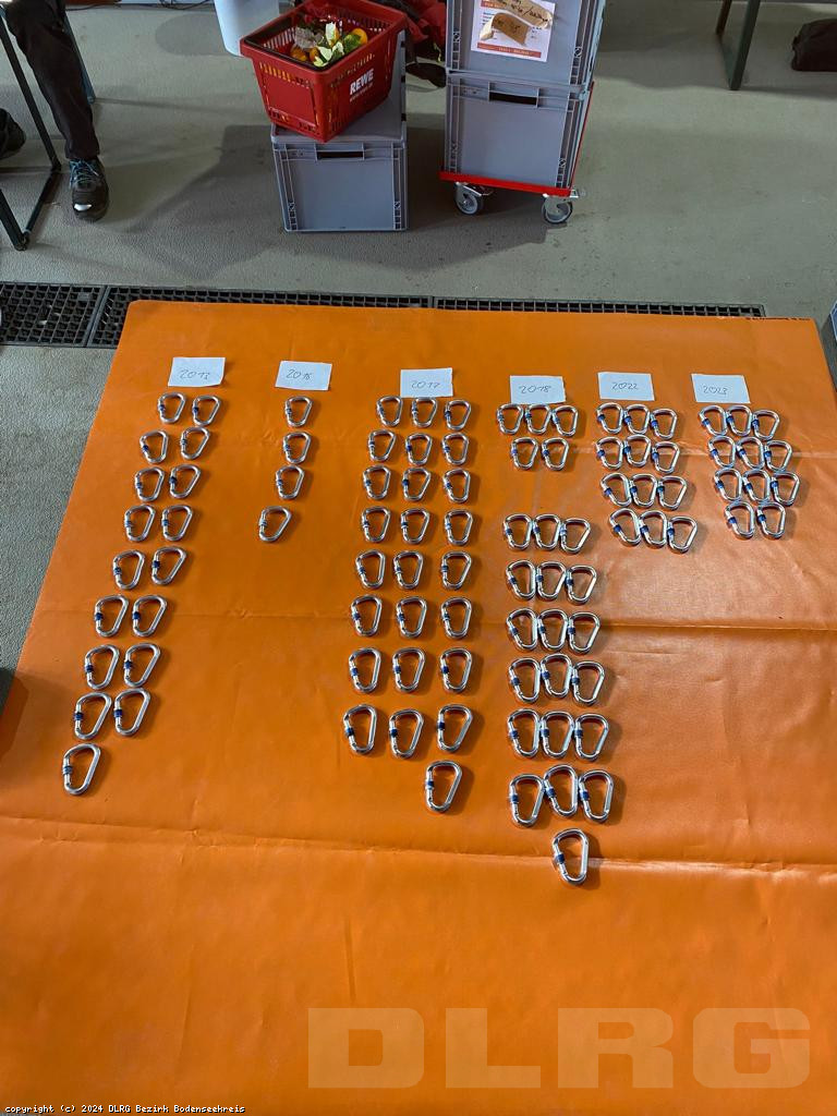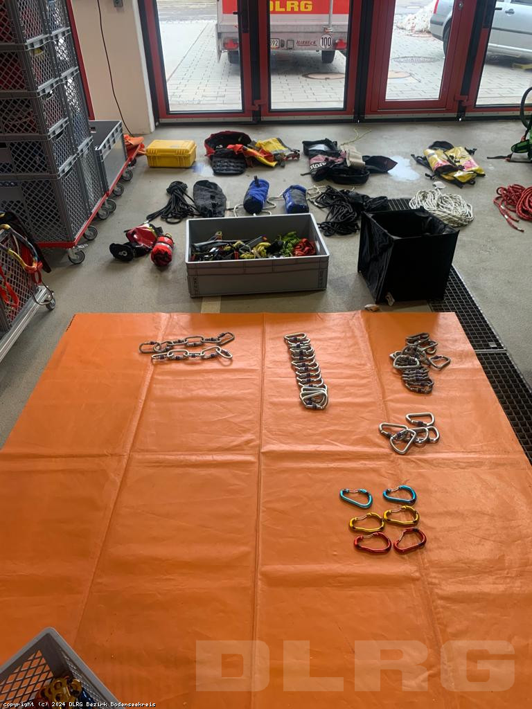 Der DLRG Bezirk Bodenseekreis führte eine kreisweite Prüfung sämtlicher Einsatzmaterialien des Fachbereichs Strömungsrettung durch. Hierzu gehören Klettergurte, Bandmaterial (wie Selbstsicherungen, Bandschlingen, Ankerplatzschlingen), Abseilgeräte, Seilmaterial, Verbindungsmittel und weitere Ausrüstungsgegenstände. Das Material wird im Rahmen von Ausbildungen und im Einsatz für den Wasser-Rettungsdienst verwendet. Die aufwendige Inspektion wurde von zehn engagierten Helfern über einen Zeitraum von zwei vollen Tagen durchgeführt. Insgesamt wurden mehrere hundert Artikel gewartet, geprüft, dokumentiert und entsprechend beschriftet. Dieser gründliche Prozess diente der Sicherstellung der Einsatzbereitschaft und der Gewährleistung höchster Standards in Bezug auf die persönliche Schutzausrüstung gegen Absturz im gesamten Bezirk.