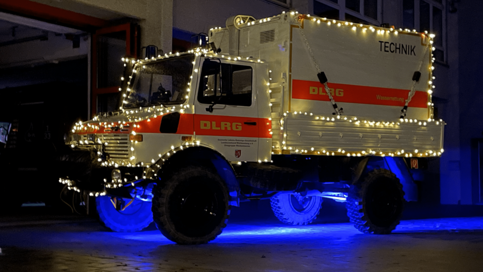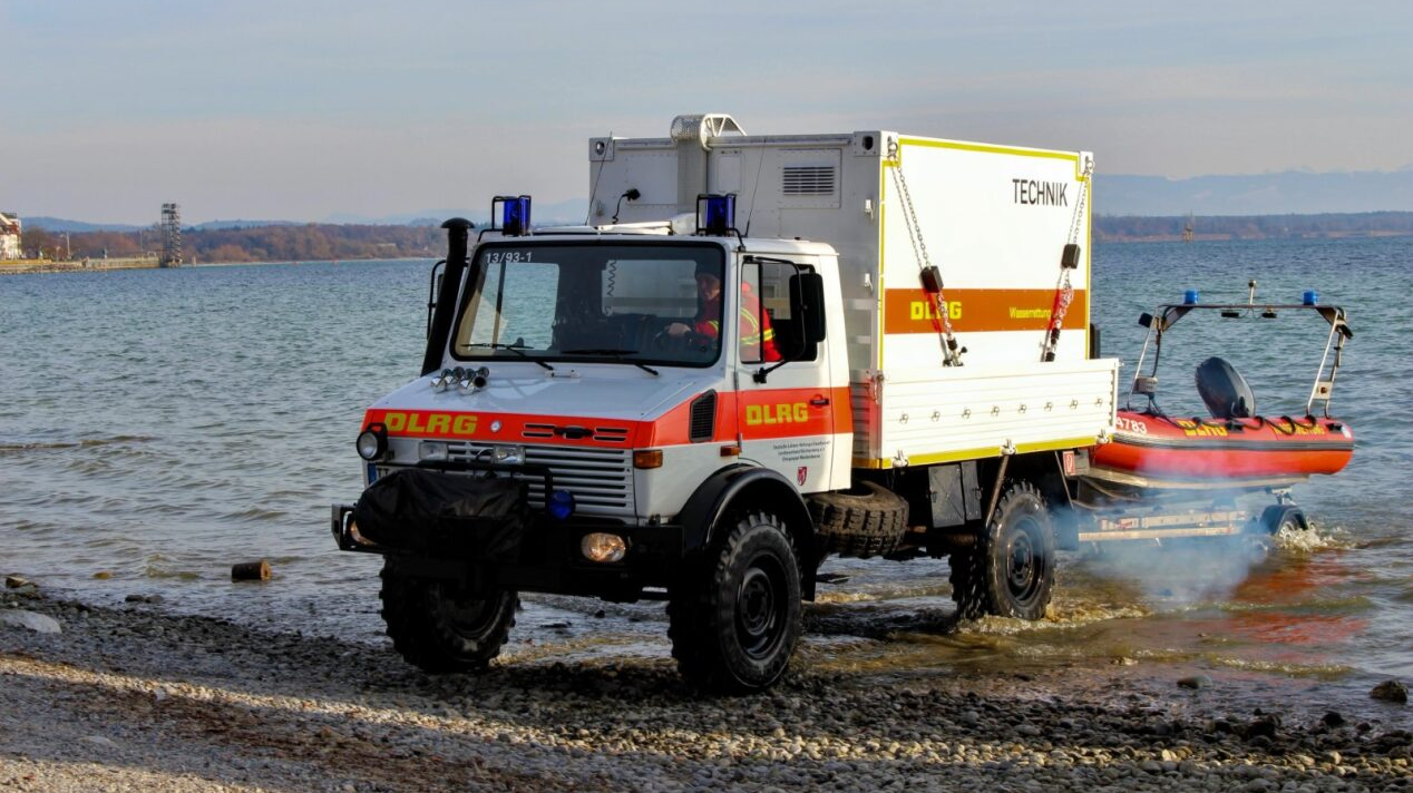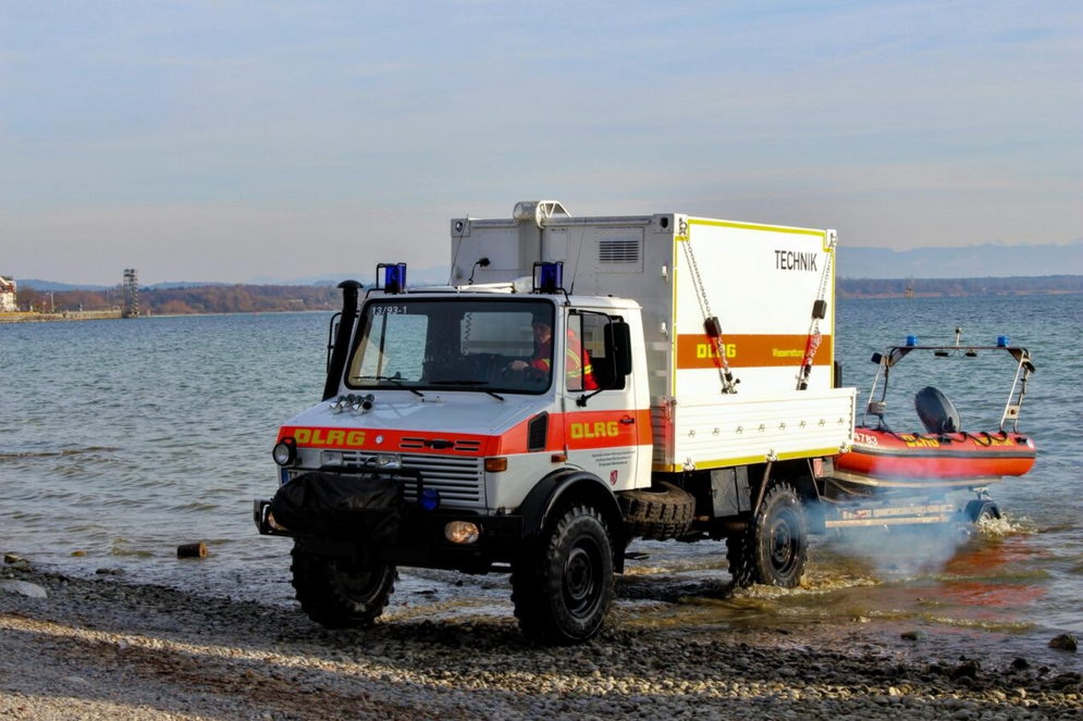 Unser Unimog 1300L ist speziell für den Hochwasser- und Geländeeinsätze ausgelegt. Als Bootsgruppen Fahrzeug (BGF) eignet er ebenfalls sich ideal für den Transport und das Slippen unseres trailerbarer Bootes. Mit einer Watttiefe von bis zu 1,20 m meistert er selbst stark überflutete Strecken und schwieriges Terrain. Was für den Einsatzt im Hochwasser esentziell ist. Außderem kommt er entlang von fließenden Gewässern wie Schussen, Argen und Rotach zum Einsatz wenn, Ausrüstung und Personal sicher an den Einsatztort gebracht werden sollen. Zusätzlich verfügt der Unimog über eine leistungsstarke Seilwinde und kann mit Technik für Bergungsarbeiten zugeladen werden.